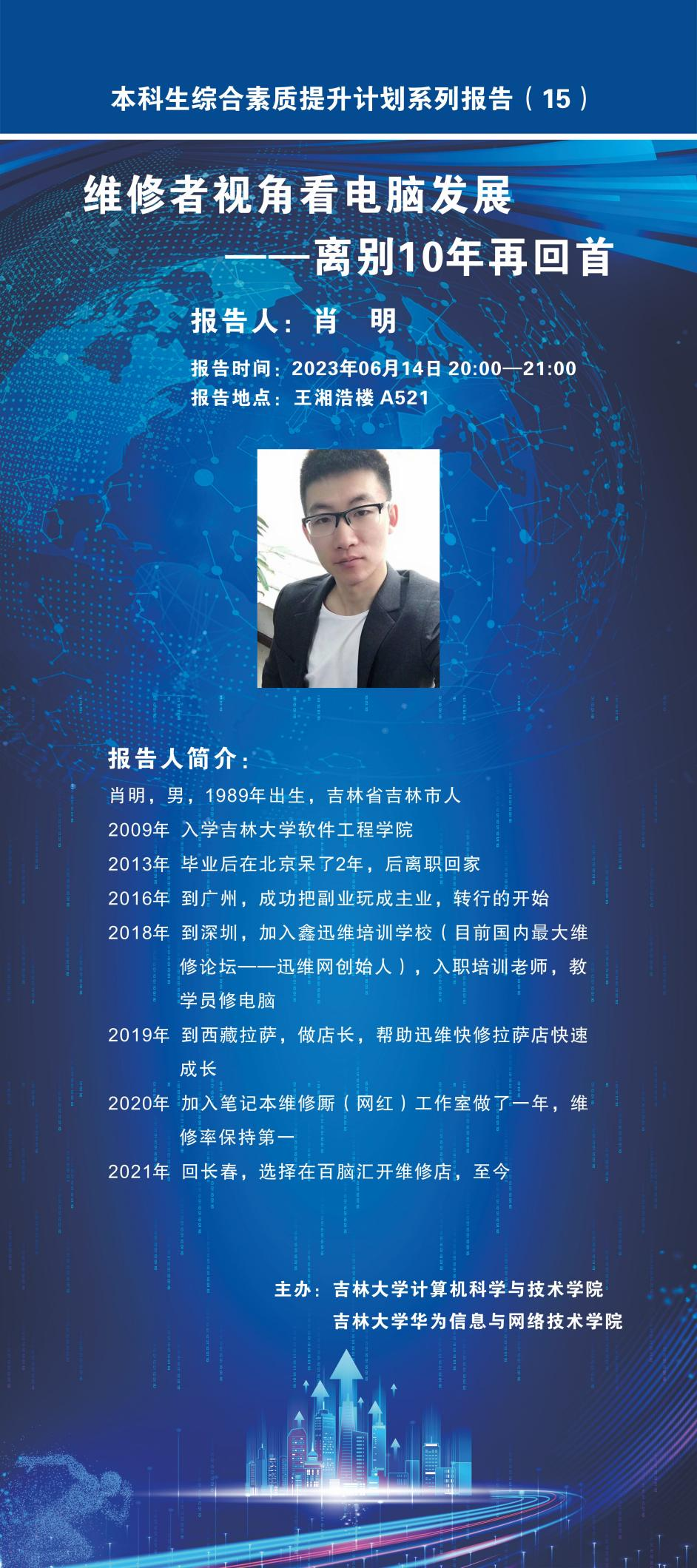 邀请,在吉林大学中心校区王湘浩楼A521报告厅作了题为“维修者视角看电脑发展——离别10年再回首”的专场讲座,也是本科生综合素质提升计划系列报告第15场。讲座由永利娱乐城