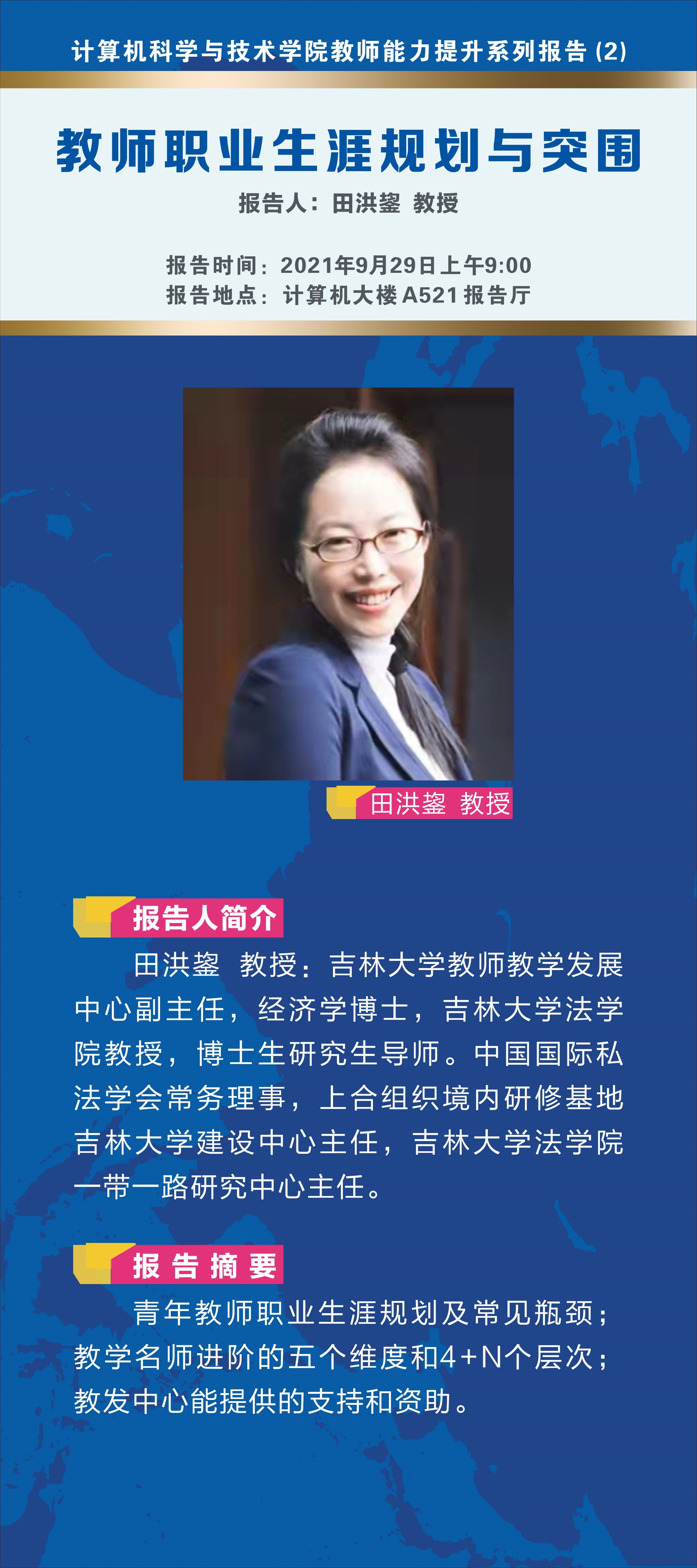 邀请,在吉林大学中心校区计算机楼A521报告厅作了题为“教师职业生涯规划与突围”的专题报告,这是计算机学科教师能力提升系列报告的第二场报告,报告由永利娱乐城